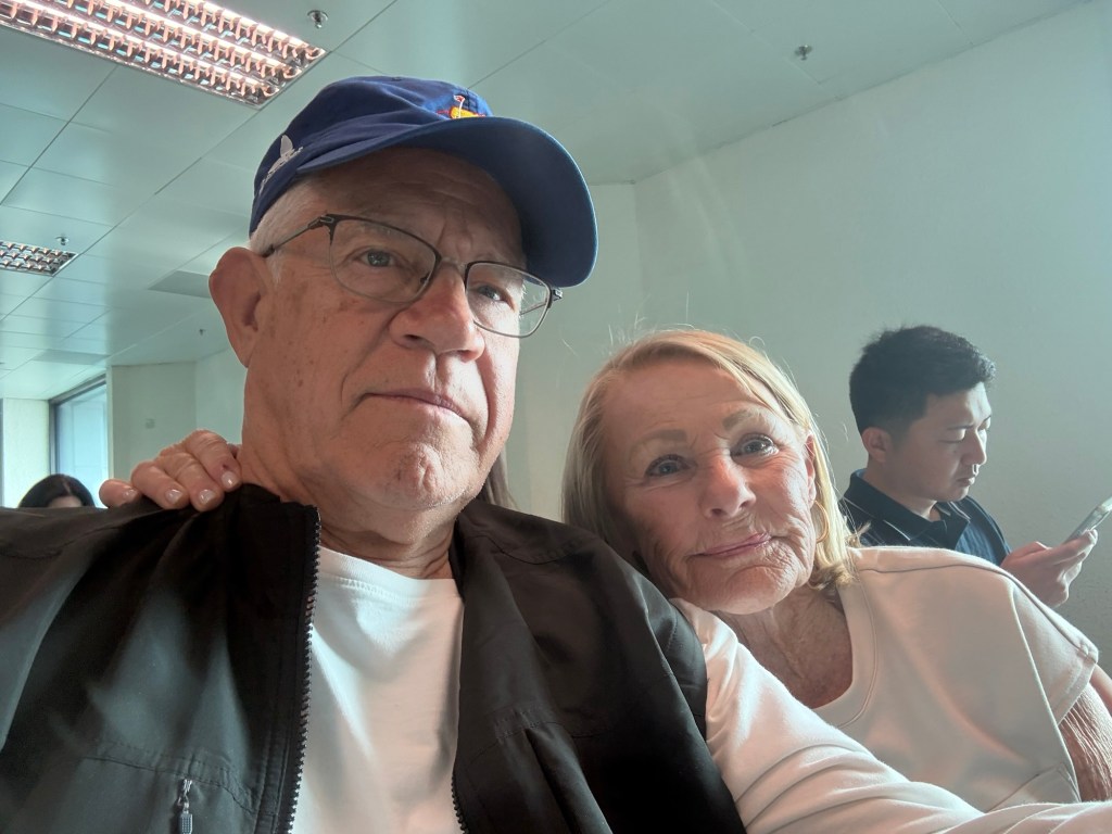 Finally we are at the gate. My birthday girl relaxes with the captain.