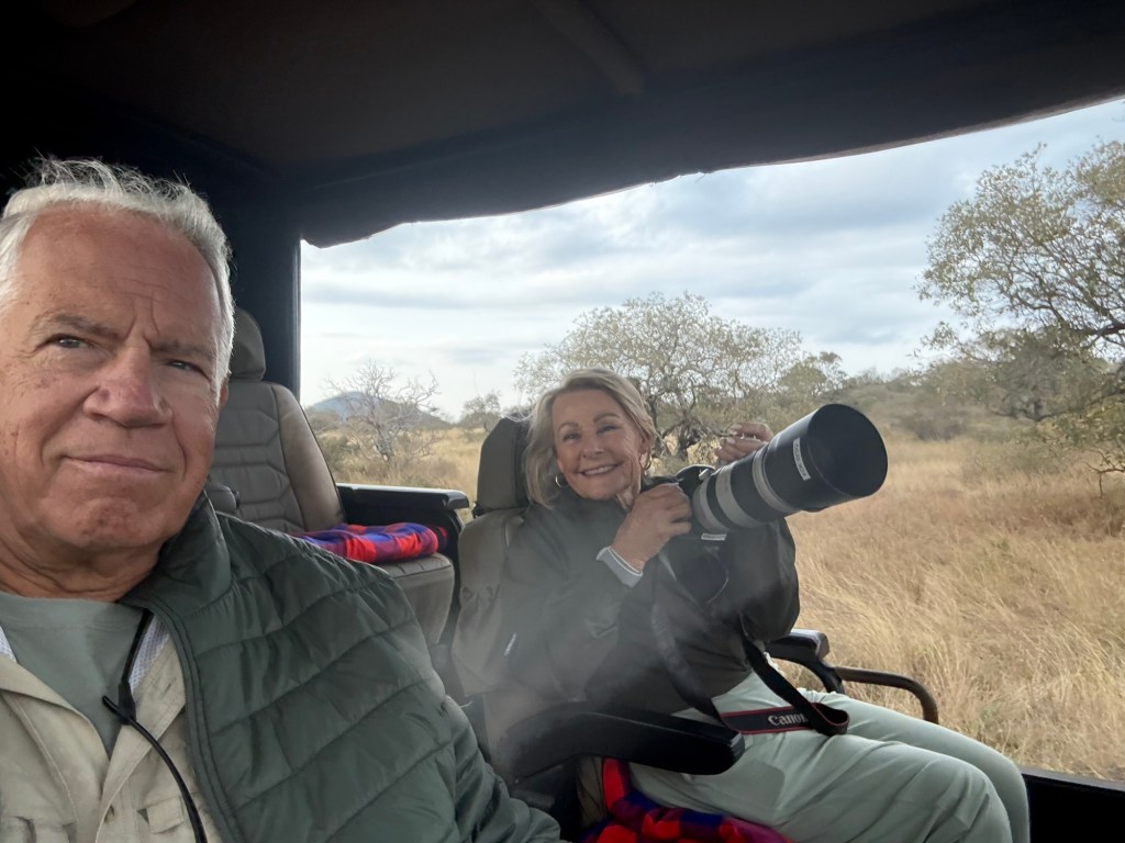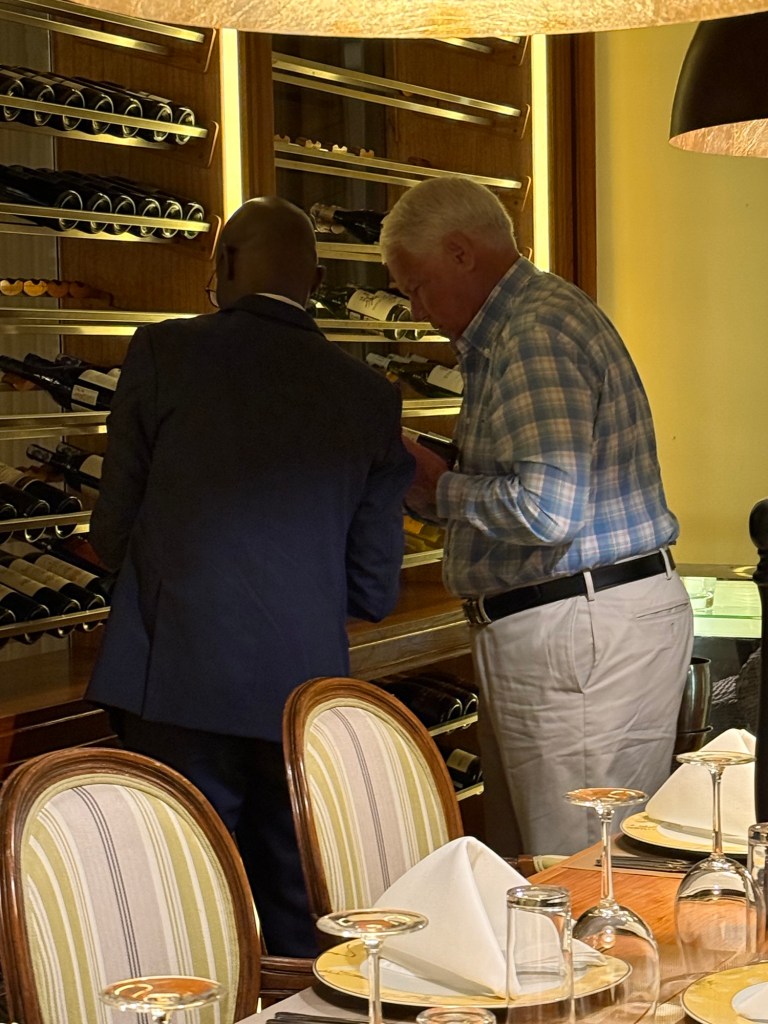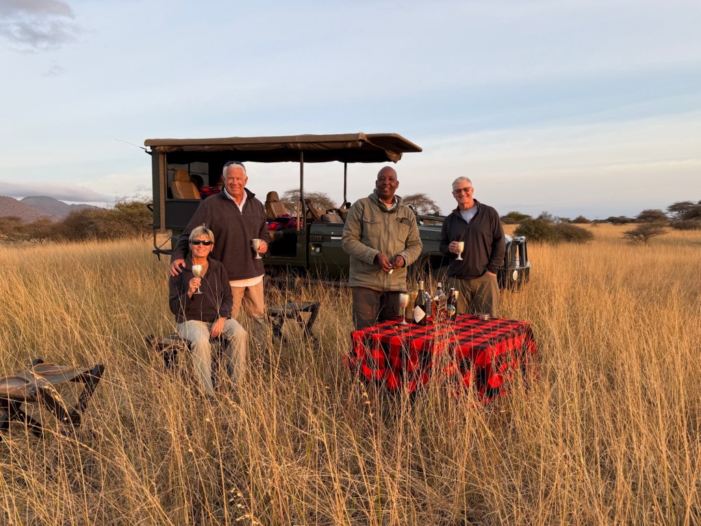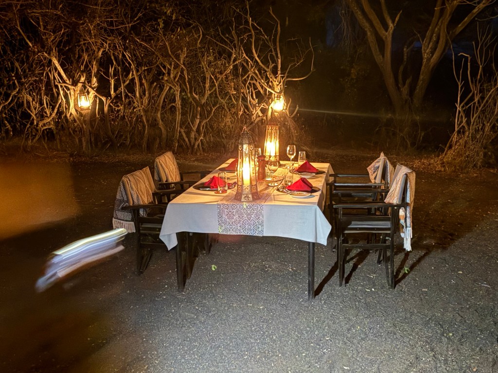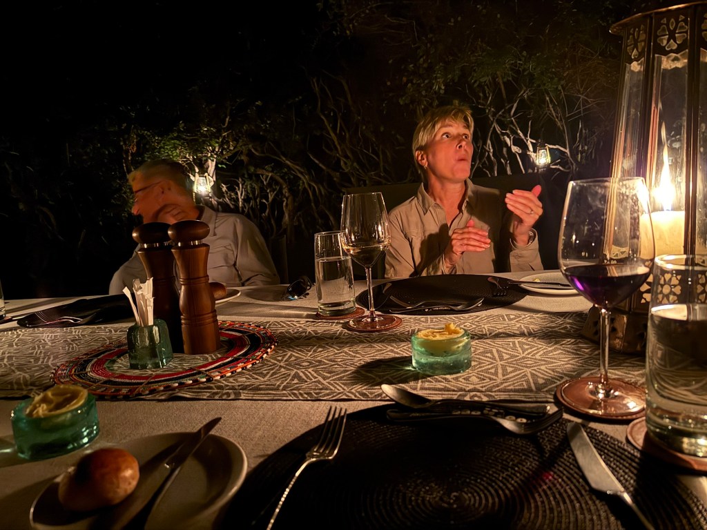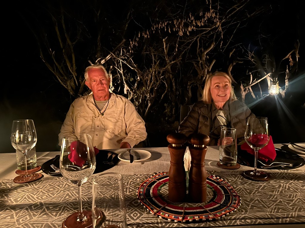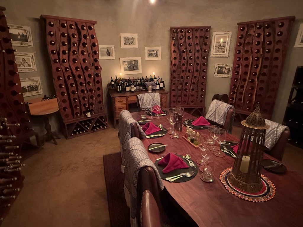 Well we came back to a pouring rain. I had planned a dinner in the bush because it was the Princess and my 52 wedding anniversary. The rain put a damper on that. So instead Rolex our server put is in the wine room. A few pics from that special occasion with special friends.