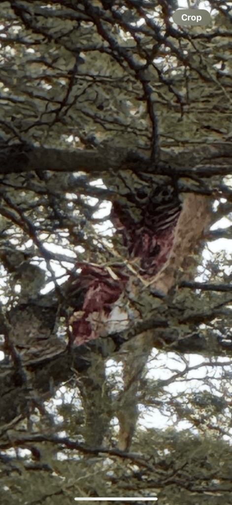 The we found her kill. In the tree to protect it from other animals and to feast on later. That is your bushman tip of the day. Store your kill high!